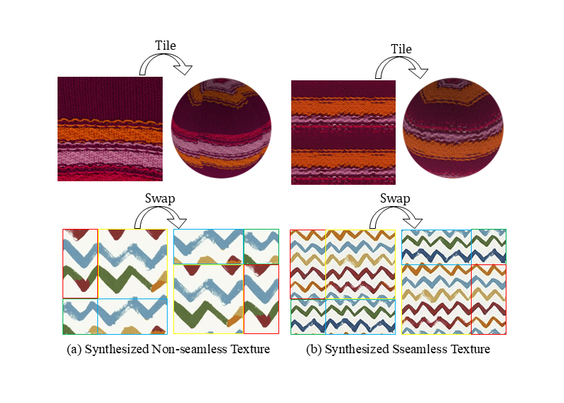 The seamless textures can be divided into arbitrary \(2 × 2\) patches that preserve their tileability even after being diagonally interchanged.